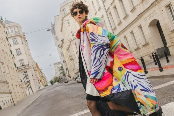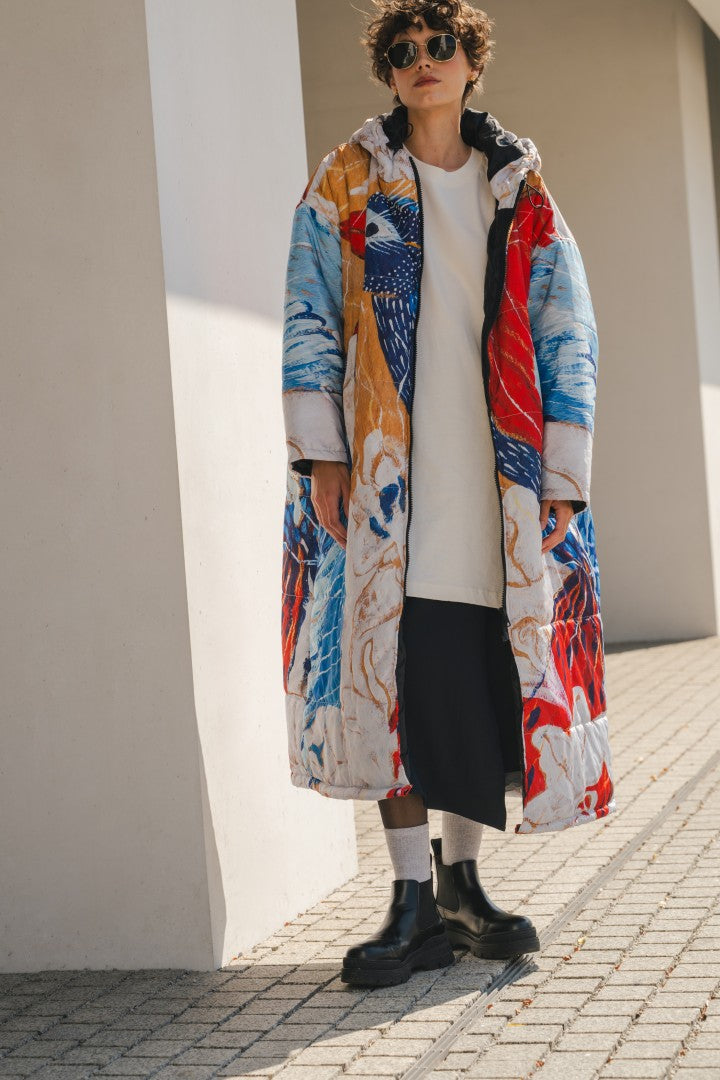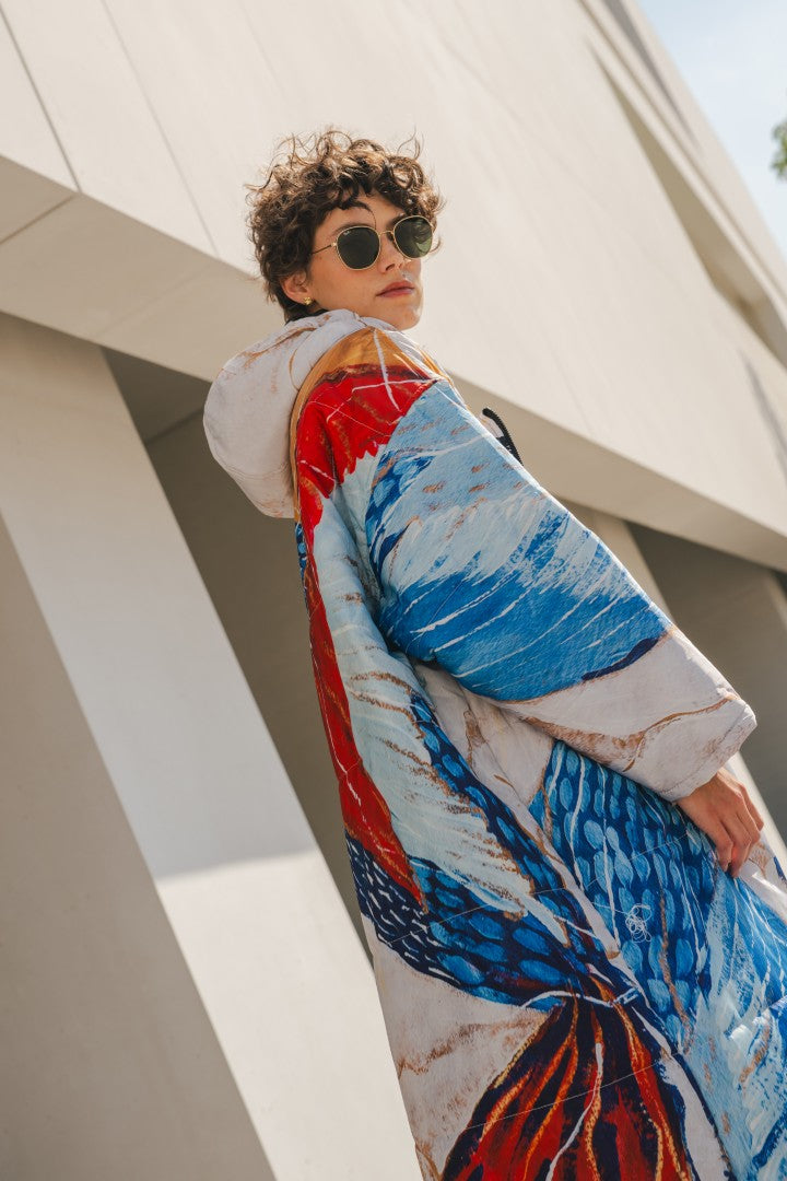 Known for her expressive botanical works, Galán Camps creates paintings shaped by emotion, movement, and everyday life. Her vibrant birds and plant forms bring color and warmth to a Sittingsuit designed for long moments outdoors.