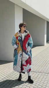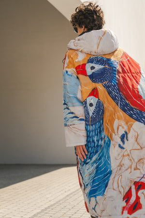 Blue Bird is created in collaboration with Florencia Galán Camps. The artwork features her signature birds and botanical forms, translated into a layered, hand painted composition. Deep blues, bright reds, and warm ochres move across the surface, creating a sense of rhythm and calm at the same time.