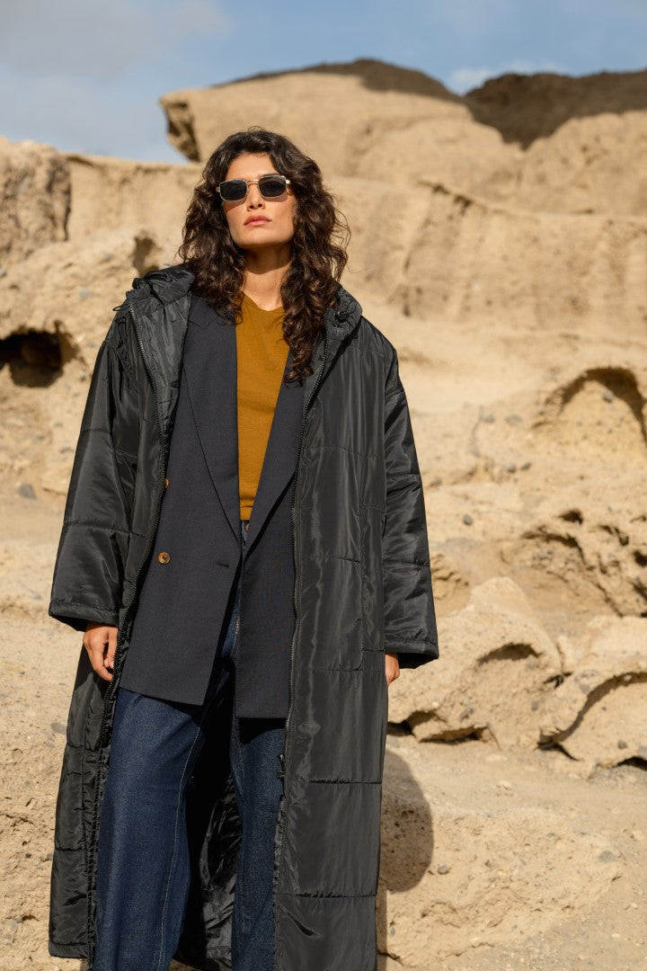 The generous cut allows room for layering while maintaining a clean, structured shape. The length, sleeve shape, and shoulder construction allow the Sittingsuit to adapt naturally to different heights while keeping its intended silhouette.