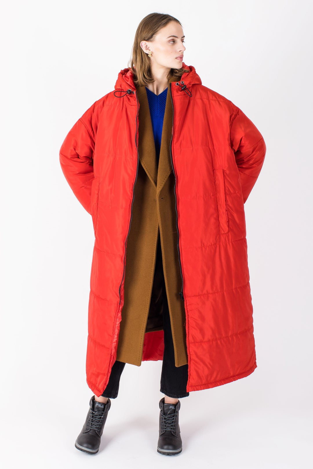 Sittingsuits are designed to be oversized. The straight column silhouette allows free movement while maintaining structure. Drop-shoulders and wide sleeves give flexibility and comfort. The design accommodates layering, from light indoor clothing to thicker outdoor layers.