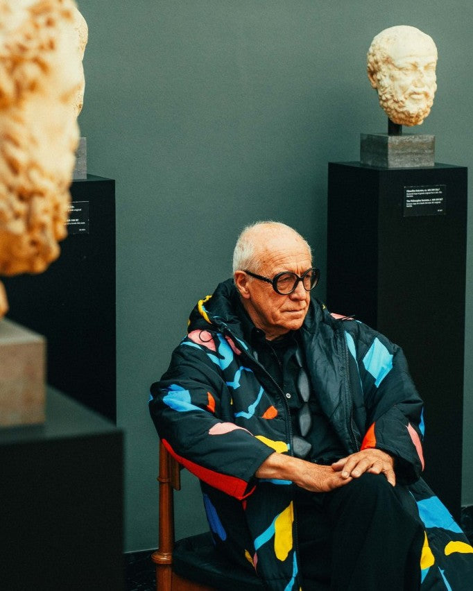 Ditlev Tamm sitting in a chair surrounded by classical sculpture heads in Ny Carlsbrg Glyptotek Copenhagen.