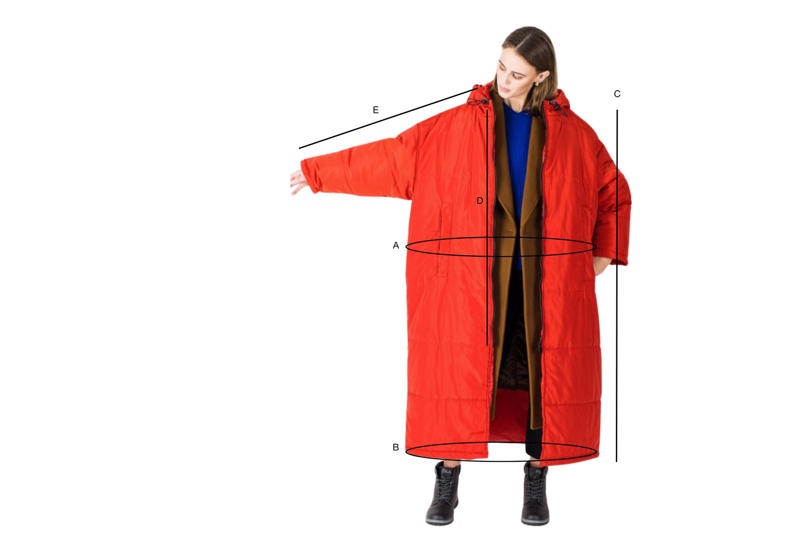 All Sittingsuits are one size and unisex.A / Body circumference - 172 cm / 68″B / Bottom circumference - 172 cm / 68″C / Full length - 130 cm / 51″D / Zipper - 85 cm / 33,5″E / Shoulder and sleeve - 72cm / 28,4″
