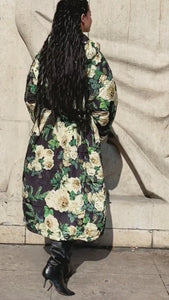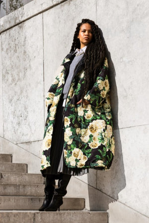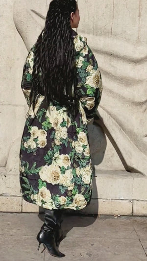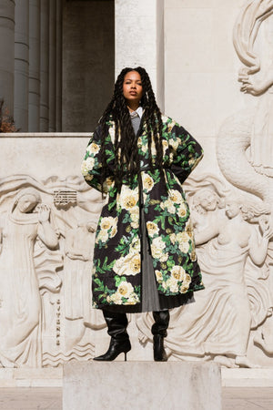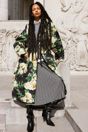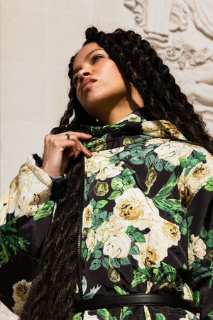 Winter Garden Sittingsuit with elegant flowers in white and green tones on a black background. The zipper and lining fabric are black.